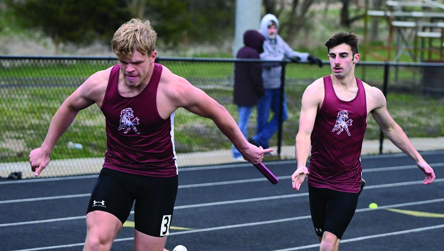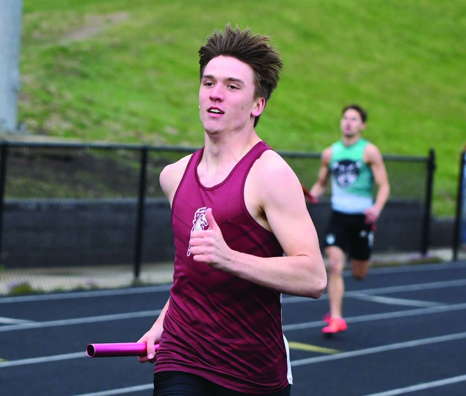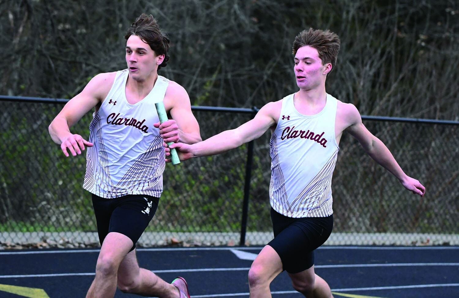 Clarinda sophomore Nolan Wagoner (right) hands the baton to