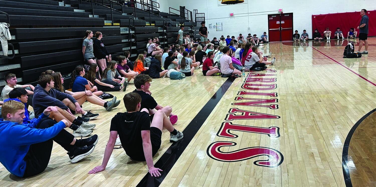 Members of Clarinda's large track and field team hear from head coach Chad Blank (far right) prior to a practice Wednesday, March 18. Blank has over 100 athletes in the program.