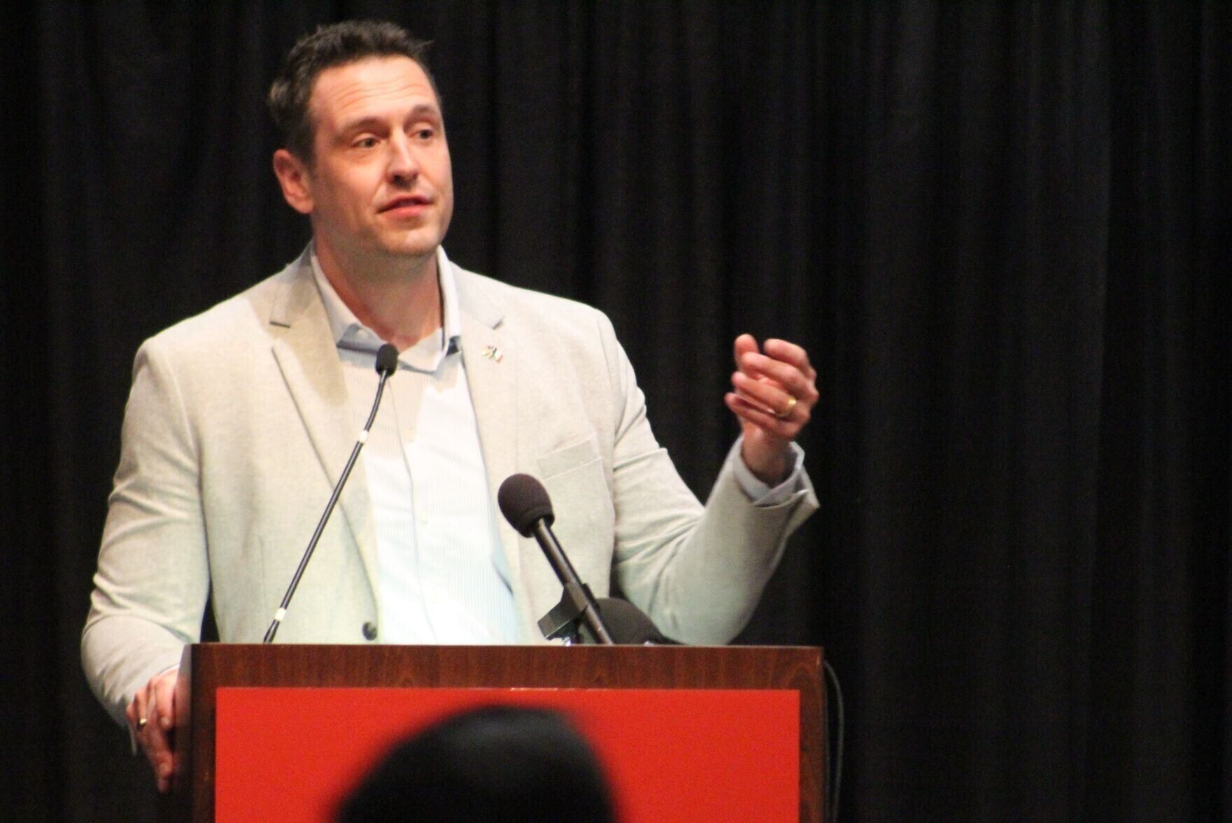 Zach Lahn, a business owner from Belle Plaine and Republican candidate for governor, speaks at the Republican Party of Polk County’s Lincoln Dinner fundraiser at the Holiday Inn-Des Moines Airport and Conference Center in Des Moines on Thursday, March 26, 2026.