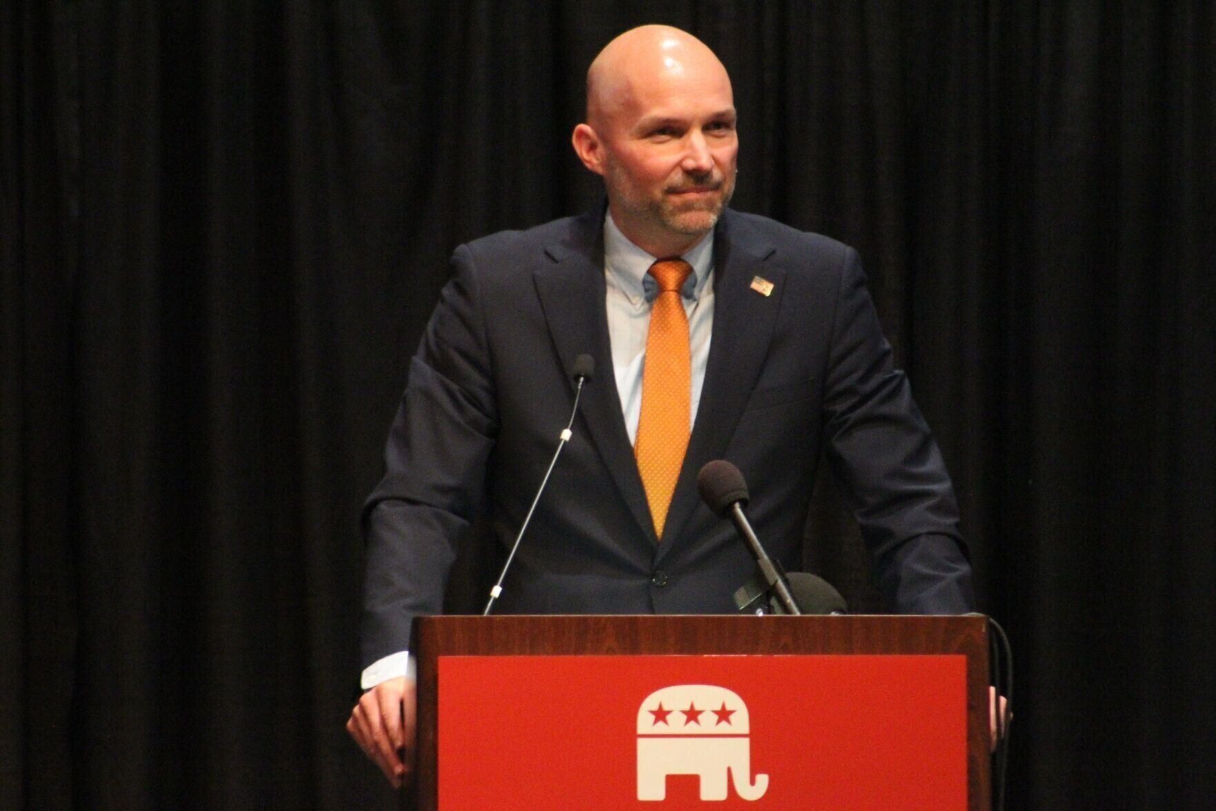 Eddie Andrews, a state legislator from Johnston and Republican candidate for governor, speaks at the Republican Party of Polk County’s Lincoln Dinner fundraiser at the Holiday Inn-Des Moines Airport and Conference Center in Des Moines on Thursday, March 26, 2026.