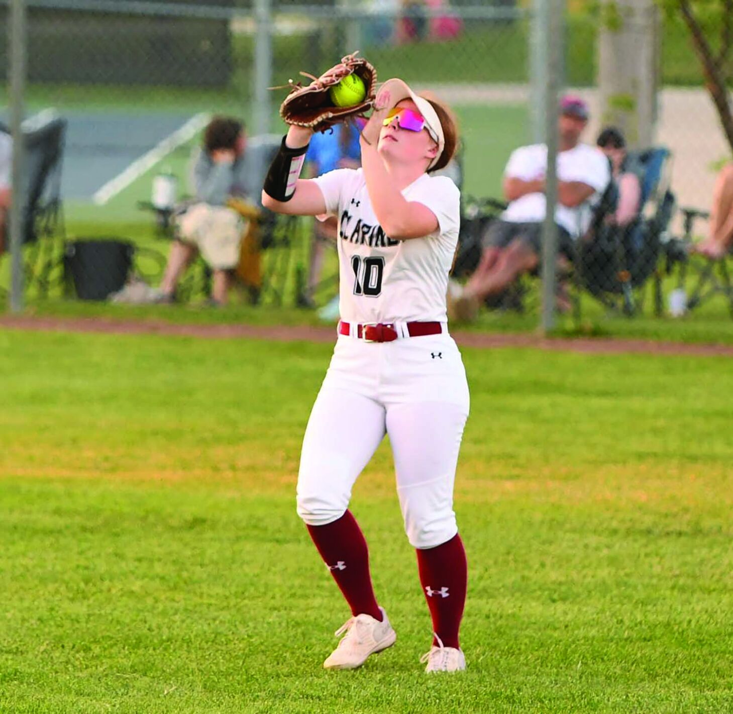 Clarinda junior Maddie Cole secures a catch in center field