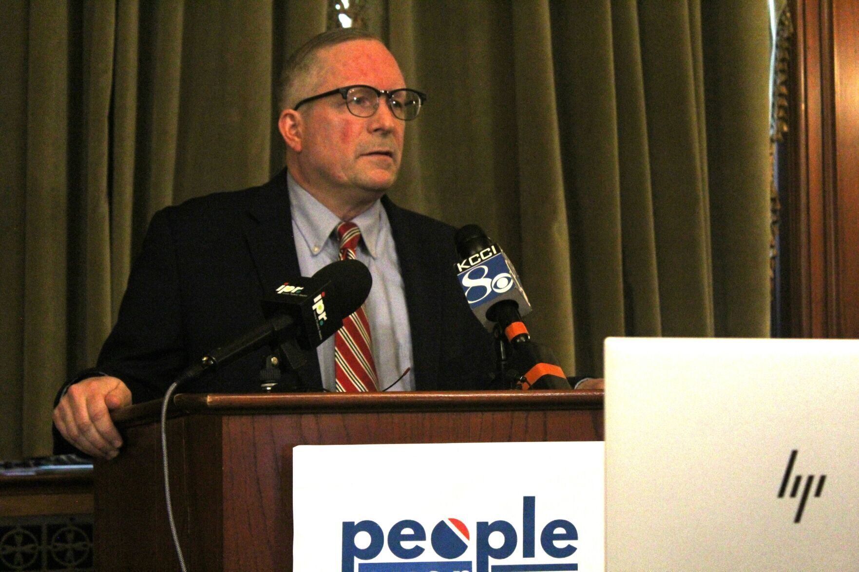 Iowa Rep. Brian Meyer, D-Des Moines, speaks to reporters at the