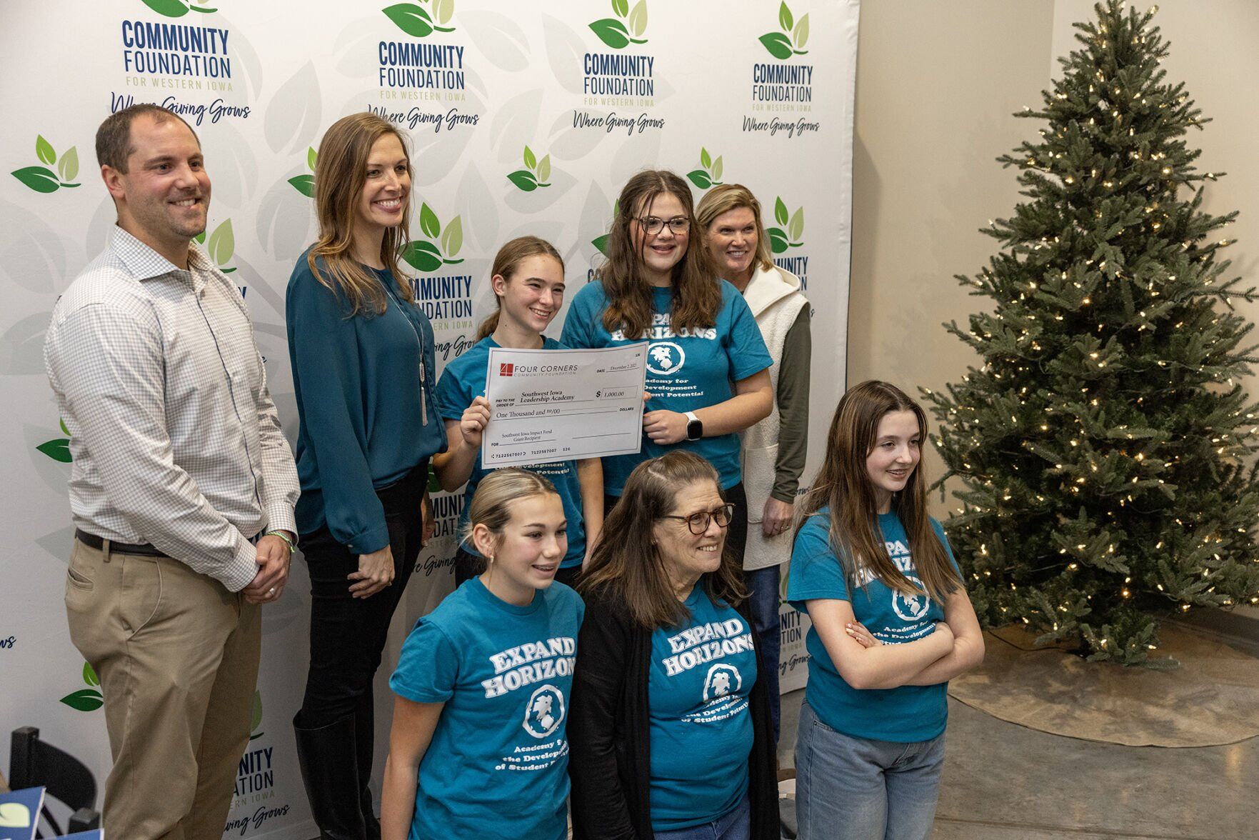 Deb Masker and students in the Southwest Iowa Leadership Academy pose for a portrait with a $1,000 check during the Community Foundation for Western Iowa's Giving Tuesday 712 party at Full Fledged Brewing on Tuesday, Dec. 2, 2025.