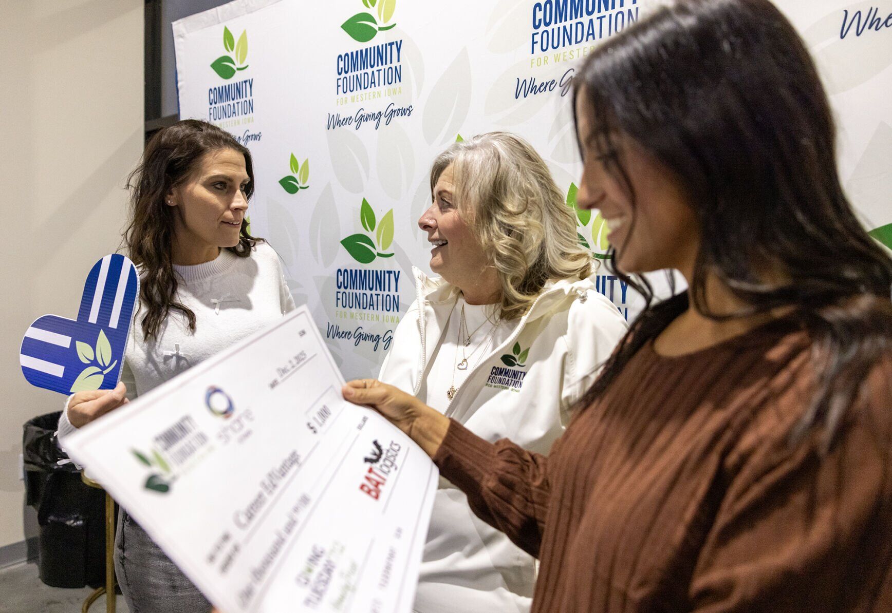 Community Foundation for Western Iowa President and CEO Donna Dostal, center, chats with Career EdVantage Executive Director Cara Cool Trede, right, and Director of Strategic Initiatives Bailey McQueen-Jones after presenting the organization with a $1,000 check during the foundation's Giving Tuesday 712 party at Full Fledged Brewing on Tuesday, Dec. 2, 2025.