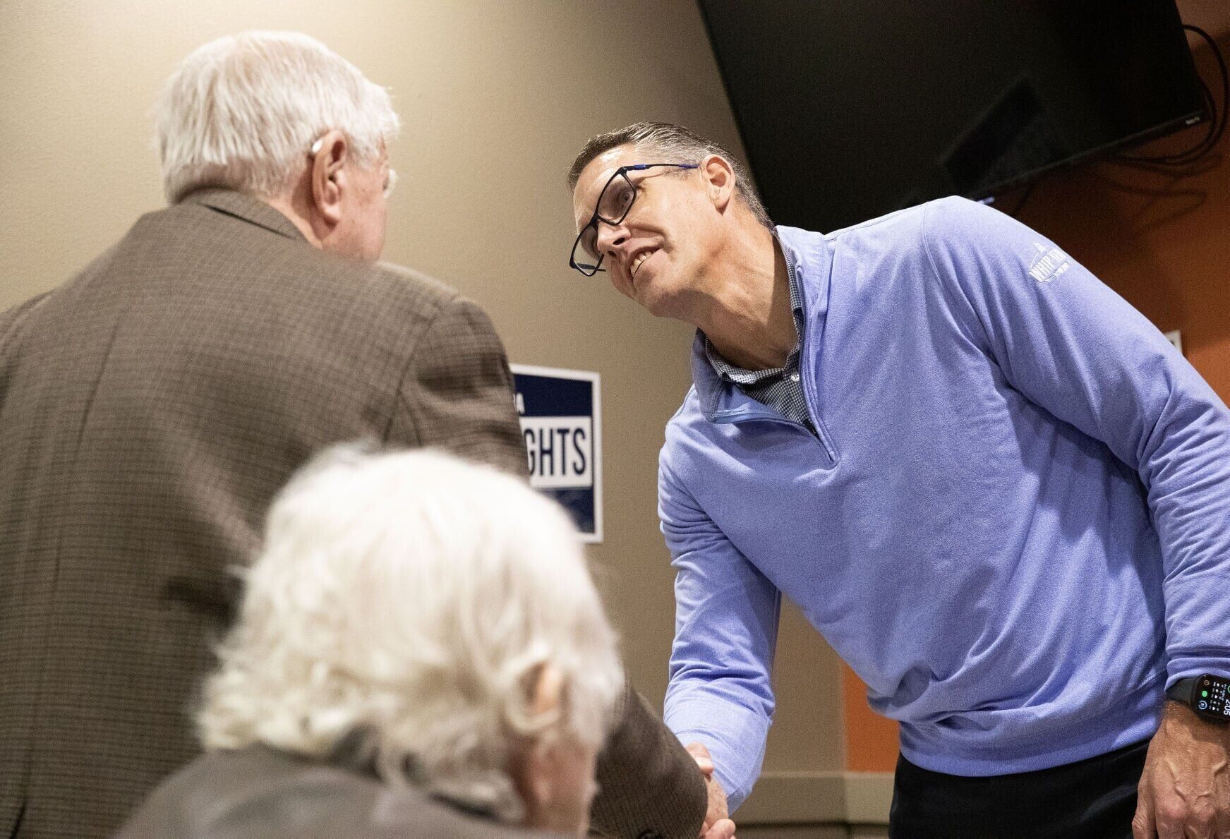 governor, greets Bill Kettel, of Iowa City, during Feenstra’s meet