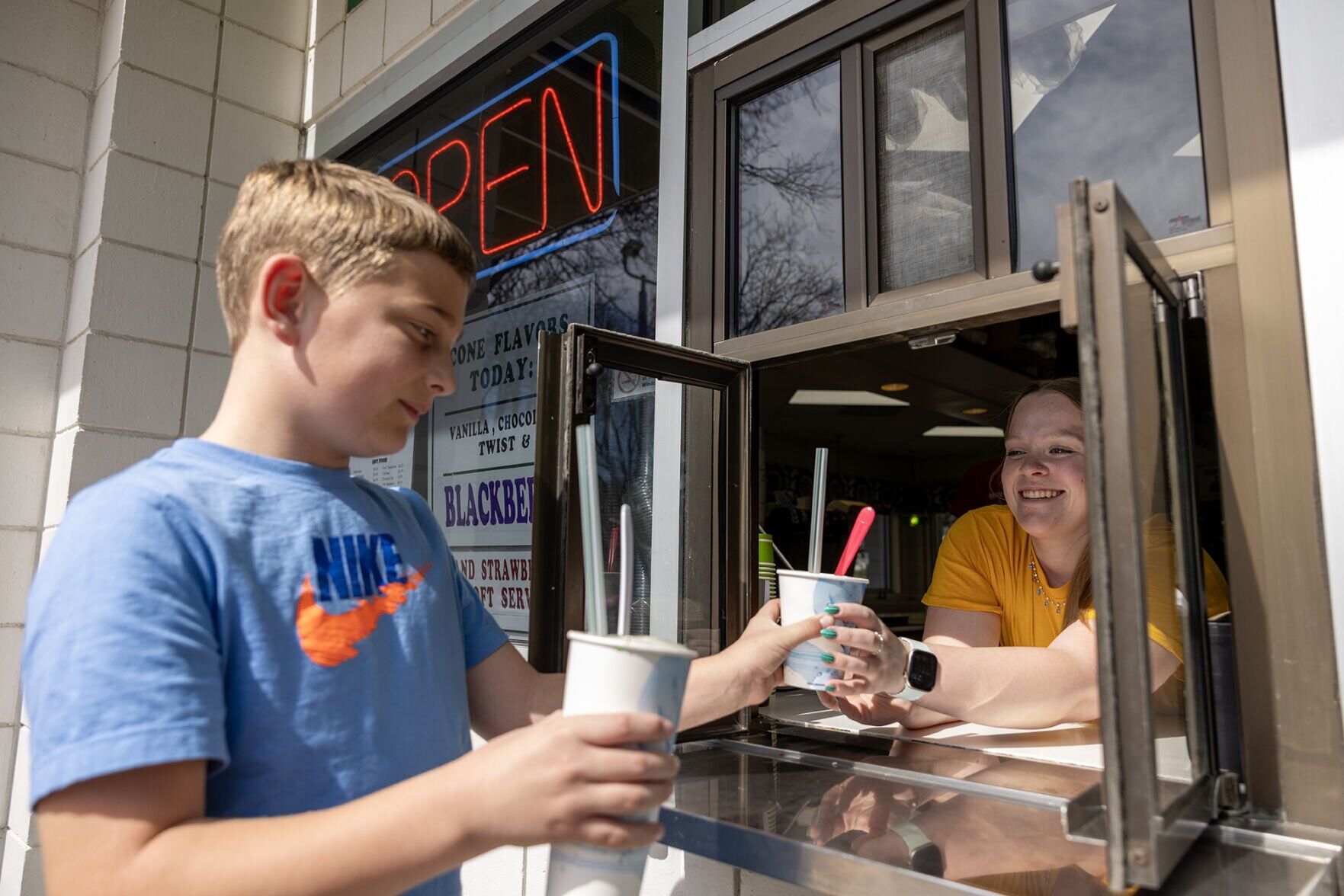 Christy Creme employee Sydney Doughman, right, hands a pair of milkshakes to Ben Flugge, 10, at the walk-up counter on Saturday, March 21, 2026.