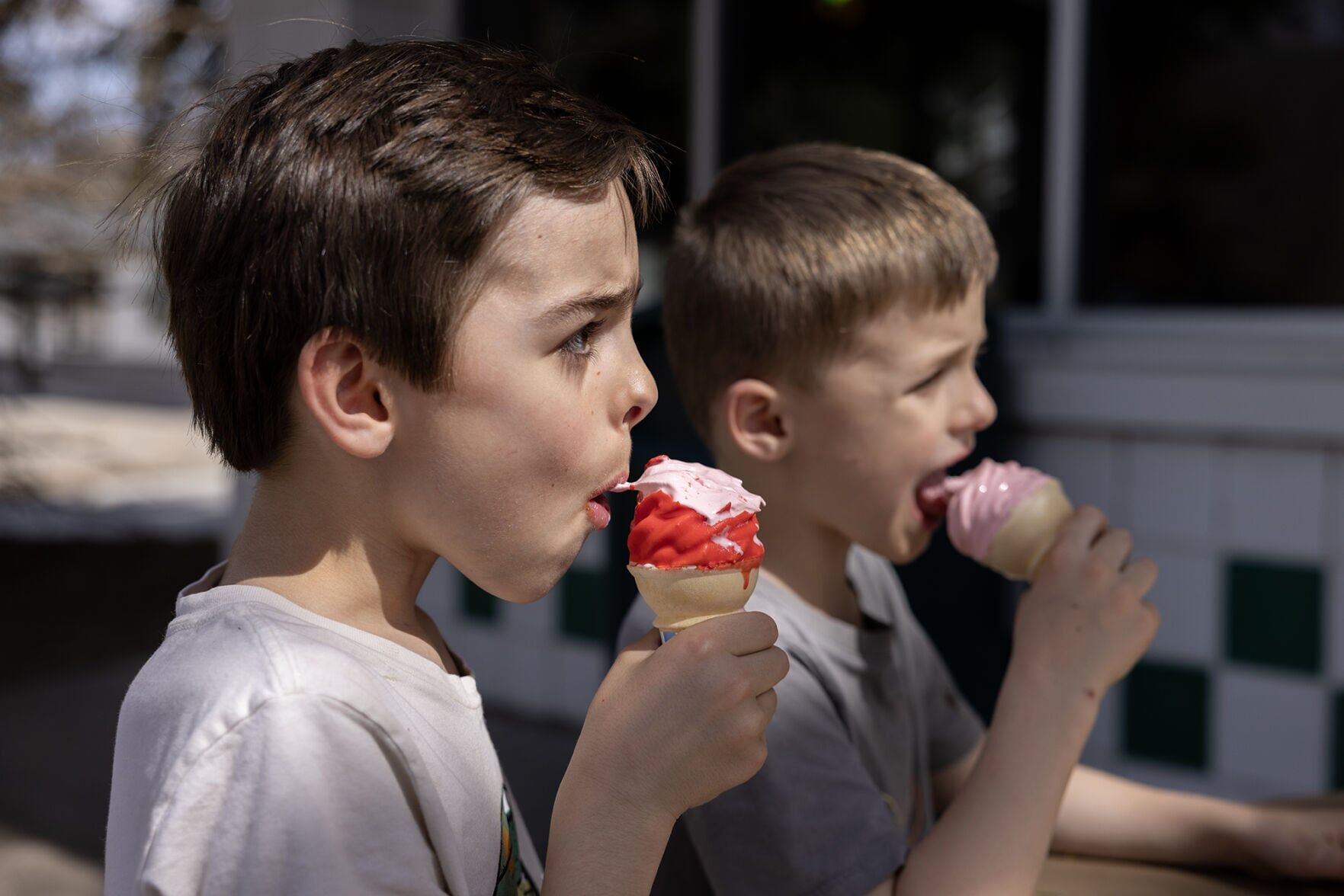 Avery Lullo, 9, left, and his brother, Ollie, 6, enjoy some ice cream cones on the Christy Creme patio on Saturday, March 21, 2026.